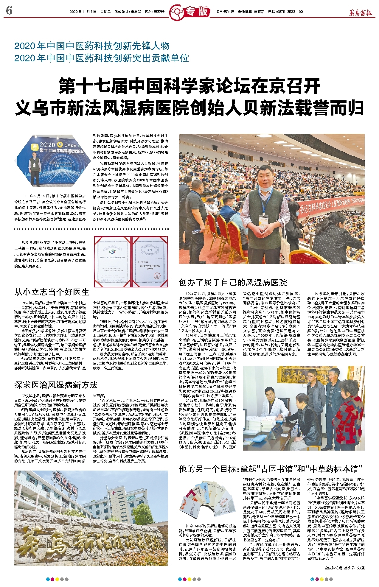 第十七届中国科学家论坛在京召开 义乌市新法风湿病医院创始人贝新法载誉而归